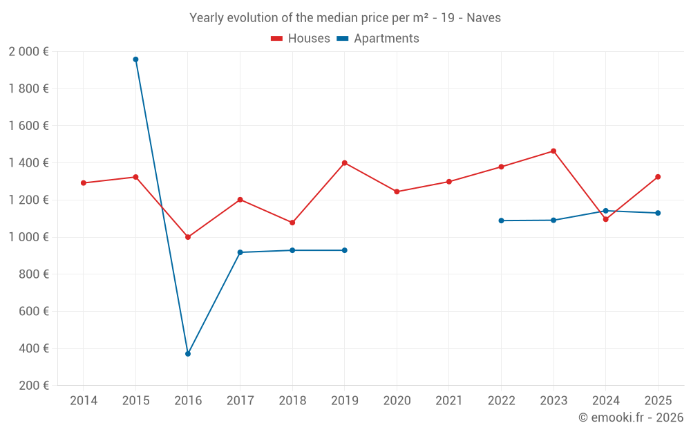 The median price on the 16 apartment transactions of the last 24 months in the municipality of Naves was 1 142 € per square meter for a median property value of 58 500 €. Over this period, 60% of transactions were between 1 076 and 1 304 € per square meter (from the 2nd to the 8th deciles).