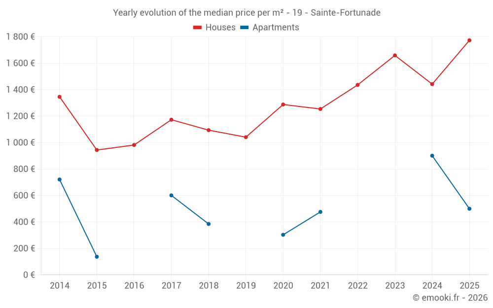 The median price on the 18 house transactions of the last 12 months in the municipality of Sainte-Fortunade was 1 442 € per square meter for a median property value of 114 500 €. Over this period, 60% of transactions were between 1 302 and 1 723 € per square meter (from the 2nd to the 8th deciles).