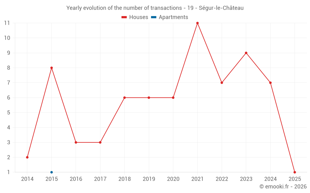 The median price on the 14 house transactions of the last 24 months in the municipality of Ségur-le-Château was 1 226 € per square meter for a median property value of 124 000 €. Over this period, 60% of transactions were between 787 and 1 869 € per square meter (from the 2nd to the 8th deciles).