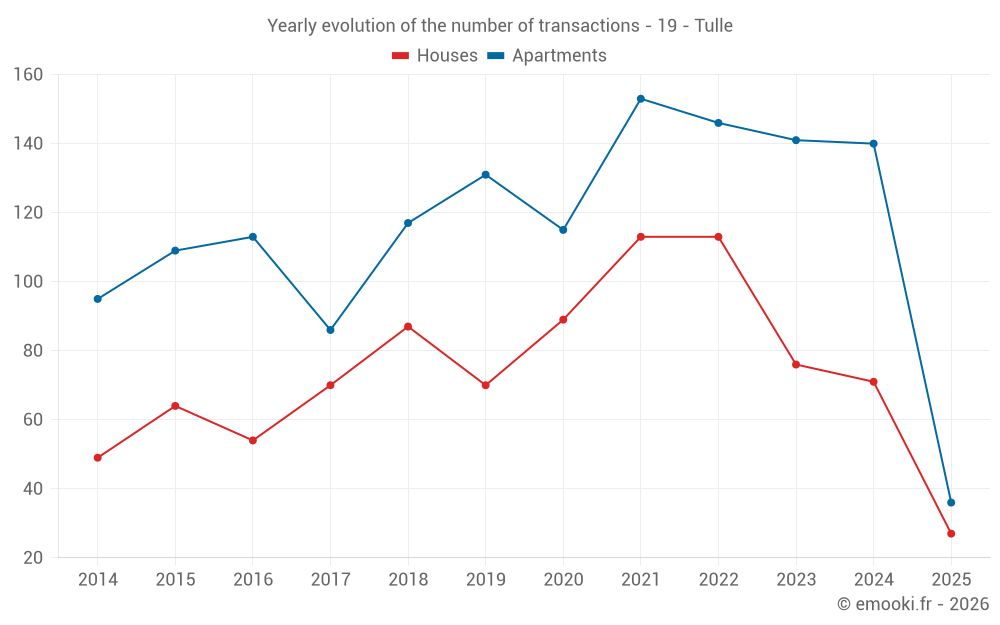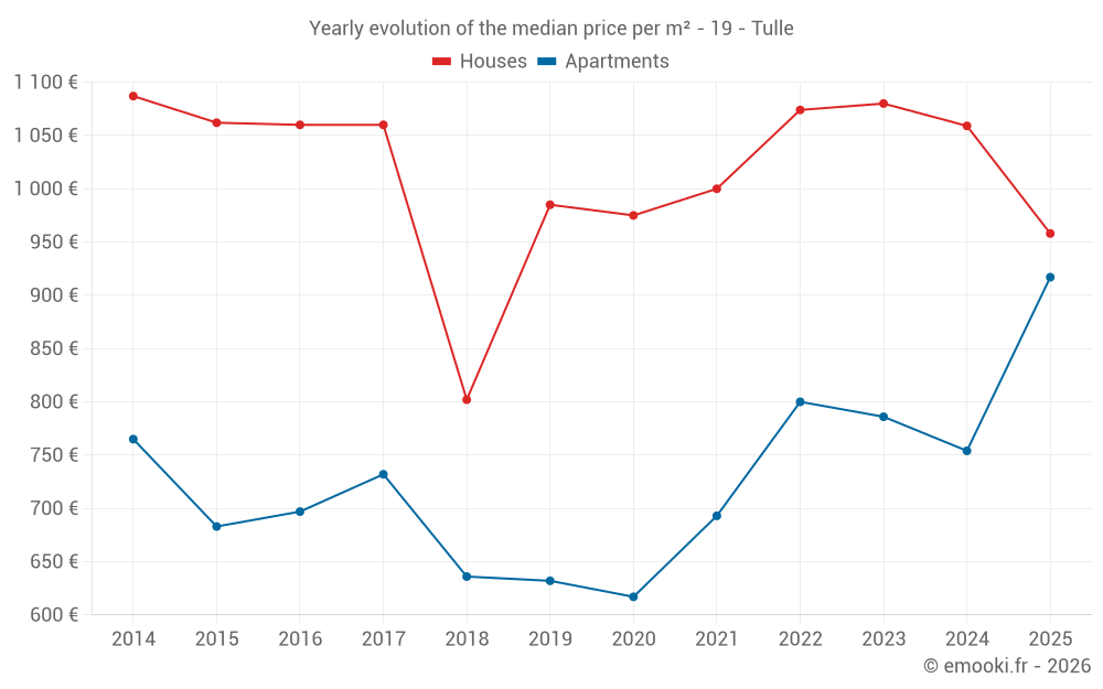 The median price on the 36 apartment transactions of the last 6 months in the municipality of Tulle was 917 € per square meter for a median property value of 50 960 €. Over this period, 60% of transactions were between 545 and 1 189 € per square meter (from the 2nd to the 8th deciles).