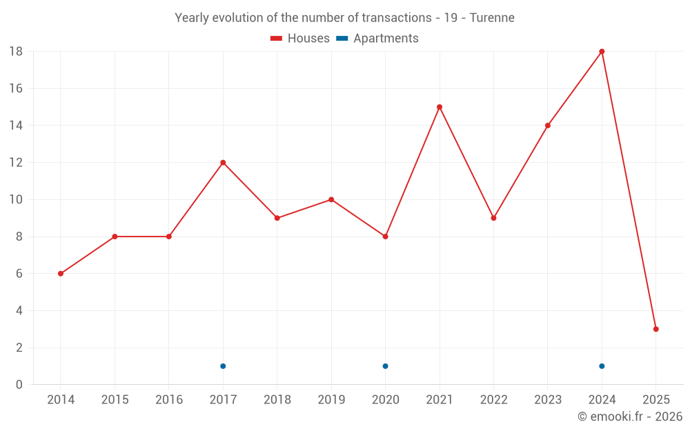 The median price on the 16 house transactions of the last 12 months in the municipality of Turenne was 1 434 € per square meter for a median property value of 152 250 €. Over this period, 60% of transactions were between 667 and 2 213 € per square meter (from the 2nd to the 8th deciles).