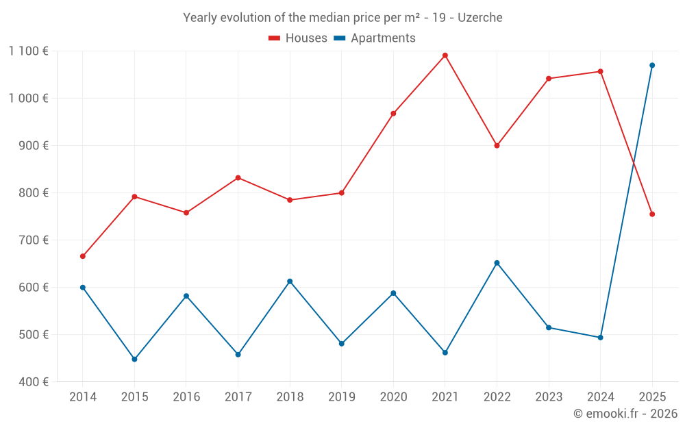 The median price on the 16 apartment transactions of the last 24 months in the municipality of Uzerche was 619 € per square meter for a median property value of 50 000 €. Over this period, 60% of transactions were between 261 and 885 € per square meter (from the 2nd to the 8th deciles).