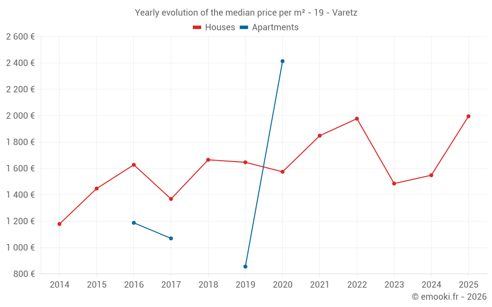 The median price on the 19 house transactions of the last 12 months in the municipality of Varetz was 1 935 € per square meter for a median property value of 157 000 €. Over this period, 60% of transactions were between 1 296 and 2 512 € per square meter (from the 2nd to the 8th deciles).