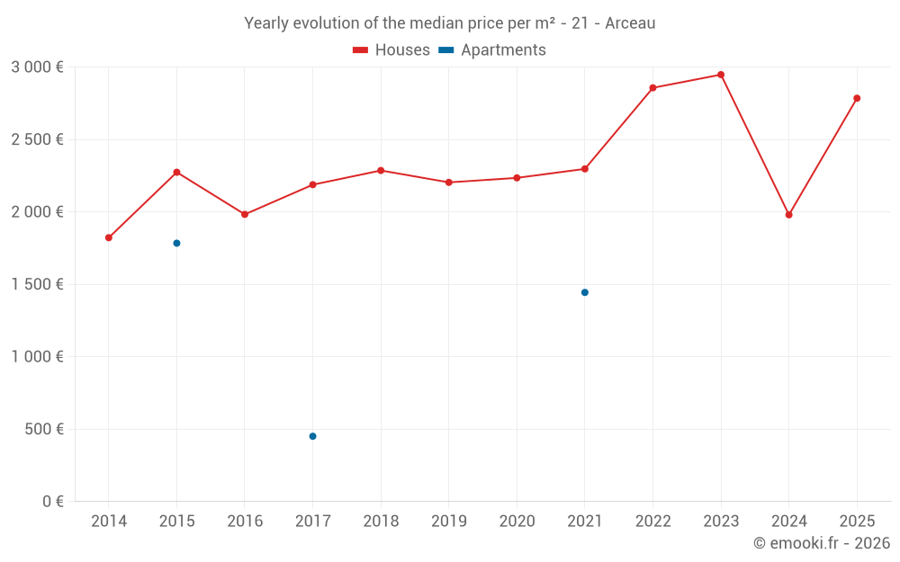 The median price on the 15 house transactions of the last 24 months in the municipality of Arceau was 2 300 € per square meter for a median property value of 322 650 €. Over this period, 60% of transactions were between 1 973 and 3 006 € per square meter (from the 2nd to the 8th deciles).