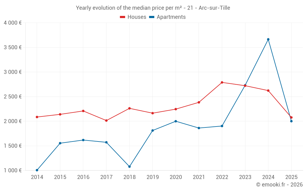 The median price on the 21 house transactions of the last 12 months in the municipality of Arc-sur-Tille was 2 292 € per square meter for a median property value of 290 000 €. Over this period, 60% of transactions were between 1 872 and 3 167 € per square meter (from the 2nd to the 8th deciles).