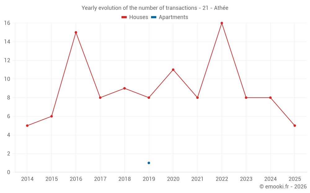 The median price on the 19 house transactions of the last 24 months in the municipality of Athée was 1 673 € per square meter for a median property value of 157 000 €. Over this period, 60% of transactions were between 1 448 and 2 120 € per square meter (from the 2nd to the 8th deciles).