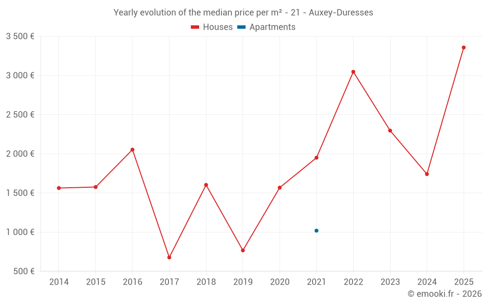 The median price on the 18 house transactions of the last 24 months in the municipality of Auxey-Duresses was 2 241 € per square meter for a median property value of 223 150 €. Over this period, 60% of transactions were between 1 033 and 2 880 € per square meter (from the 2nd to the 8th deciles).