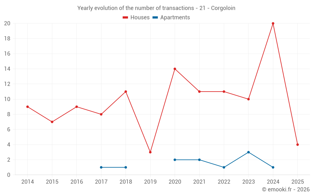The median price on the 29 house transactions of the last 24 months in the municipality of Corgoloin was 1 997 € per square meter for a median property value of 212 000 €. Over this period, 60% of transactions were between 1 641 and 2 634 € per square meter (from the 2nd to the 8th deciles).