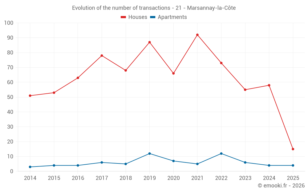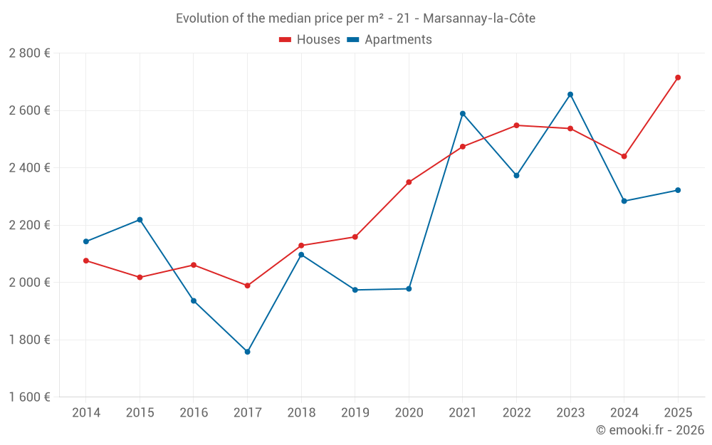 The median price on the 52 house transactions of the last 12 months in the municipality of Marsannay-la-Côte was 2 478 € per square meter for a median property value of 211 100 €. Over this period, 60% of transactions were between 2 004 and 2 768 € per square meter (from the 2nd to the 8th deciles).