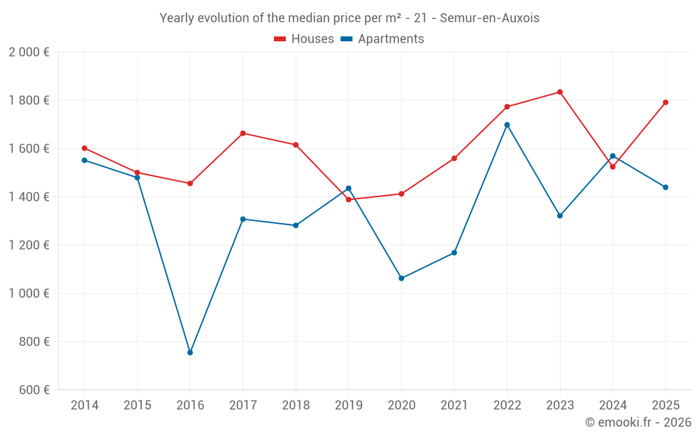 The median price on the 22 apartment transactions of the last 12 months in the municipality of Semur-en-Auxois was 1 614 € per square meter for a median property value of 85 000 €. Over this period, 60% of transactions were between 1 333 and 1 874 € per square meter (from the 2nd to the 8th deciles).