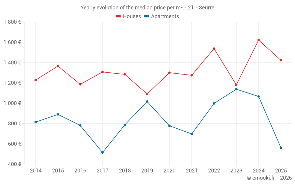 The median price on the 24 house transactions of the last 12 months in the municipality of Seurre was 1 516 € per square meter for a median property value of 136 500 €. Over this period, 60% of transactions were between 1 126 and 1 702 € per square meter (from the 2nd to the 8th deciles).
