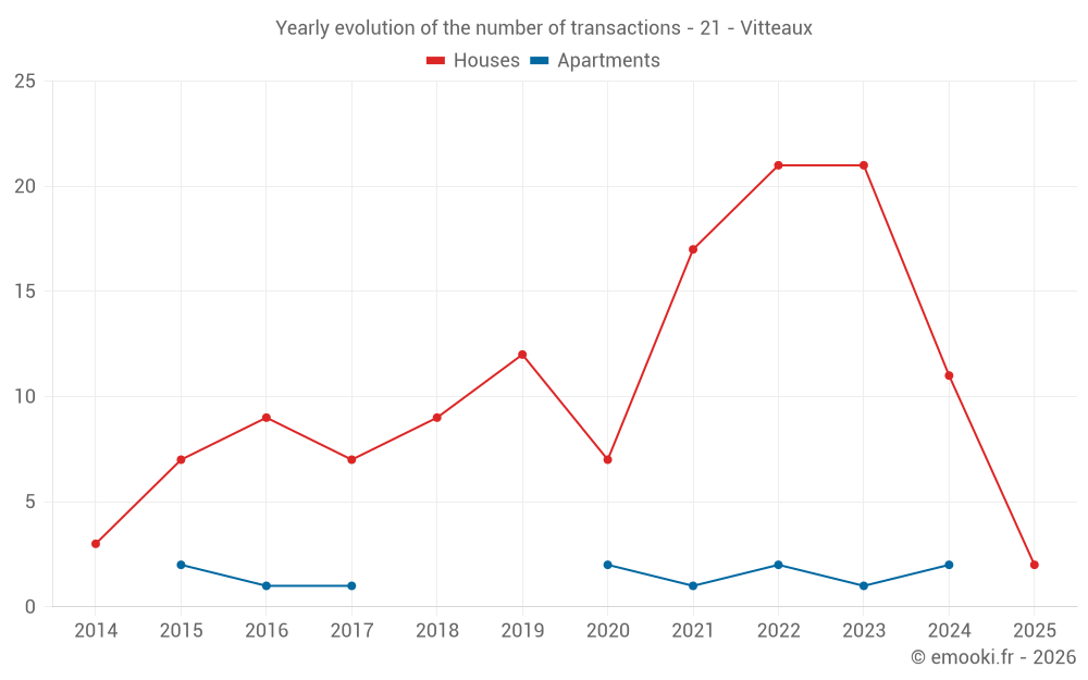 The median price on the 24 house transactions of the last 24 months in the municipality of Vitteaux was 938 € per square meter for a median property value of 72 000 €. Over this period, 60% of transactions were between 511 and 1 241 € per square meter (from the 2nd to the 8th deciles).