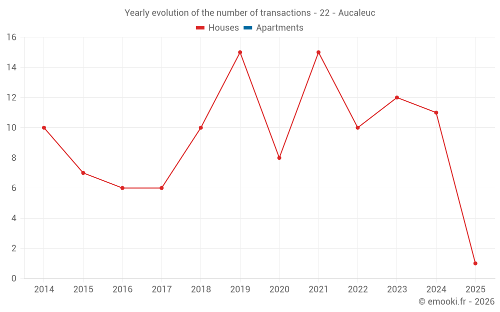 The median price on the 14 house transactions of the last 24 months in the municipality of Aucaleuc was 2 384 € per square meter for a median property value of 223 000 €. Over this period, 60% of transactions were between 1 732 and 2 558 € per square meter (from the 2nd to the 8th deciles).