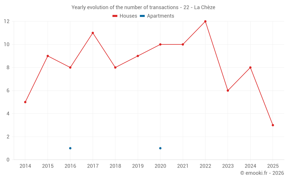 The median price on the 14 house transactions of the last 24 months in the municipality of La Chèze was 1 164 € per square meter for a median property value of 91 250 €. Over this period, 60% of transactions were between 880 and 1 427 € per square meter (from the 2nd to the 8th deciles).