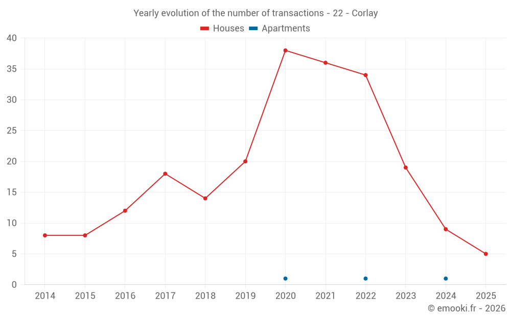 The median price on the 26 house transactions of the last 24 months in the municipality of Corlay was 1 068 € per square meter for a median property value of 122 500 €. Over this period, 60% of transactions were between 673 and 1 648 € per square meter (from the 2nd to the 8th deciles).