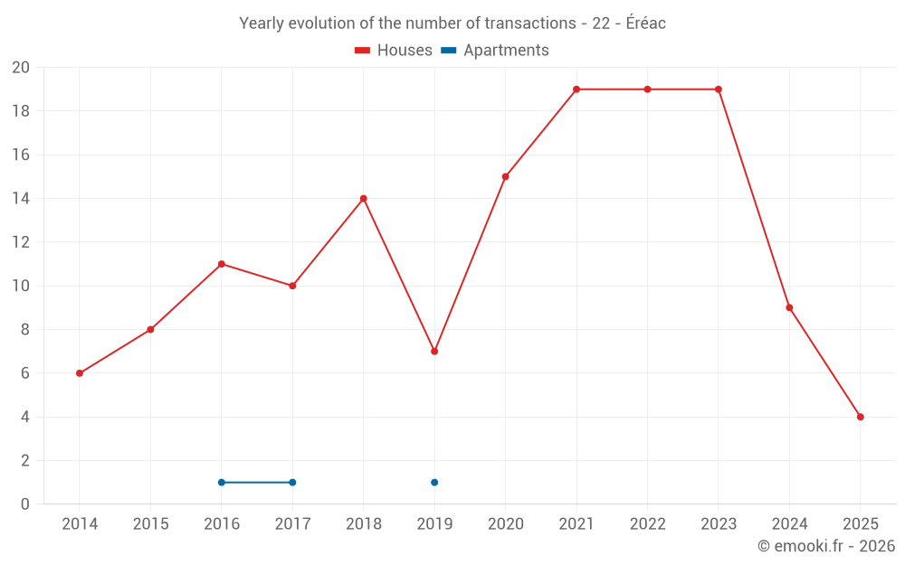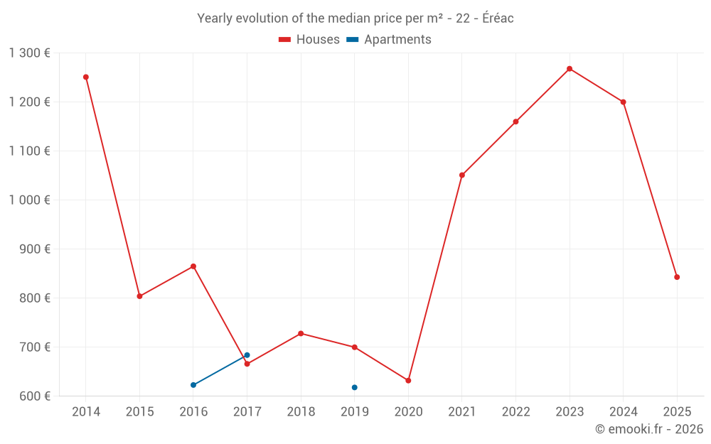 The median price on the 26 house transactions of the last 24 months in the municipality of Éréac was 1 222 € per square meter for a median property value of 117 500 €. Over this period, 60% of transactions were between 779 and 1 610 € per square meter (from the 2nd to the 8th deciles).