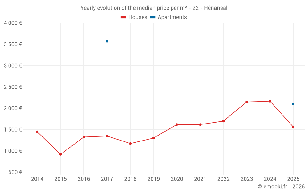 The median price on the 17 house transactions of the last 12 months in the municipality of Hénansal was 1 667 € per square meter for a median property value of 200 000 €. Over this period, 60% of transactions were between 1 215 and 2 410 € per square meter (from the 2nd to the 8th deciles).