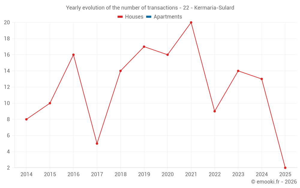 The median price on the 23 house transactions of the last 24 months in the municipality of Kermaria-Sulard was 2 333 € per square meter for a median property value of 221 000 €. Over this period, 60% of transactions were between 1 665 and 2 716 € per square meter (from the 2nd to the 8th deciles).