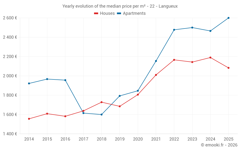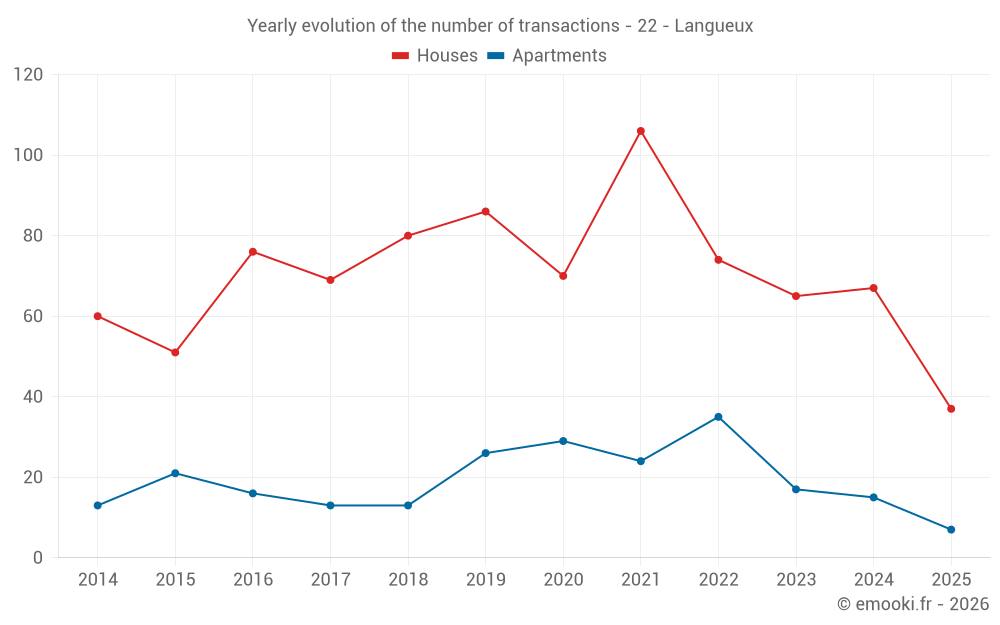 The median price on the 37 house transactions of the last 6 months in the municipality of Langueux was 2 083 € per square meter for a median property value of 249 068 €. Over this period, 60% of transactions were between 1 734 and 2 723 € per square meter (from the 2nd to the 8th deciles).