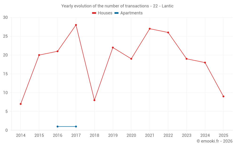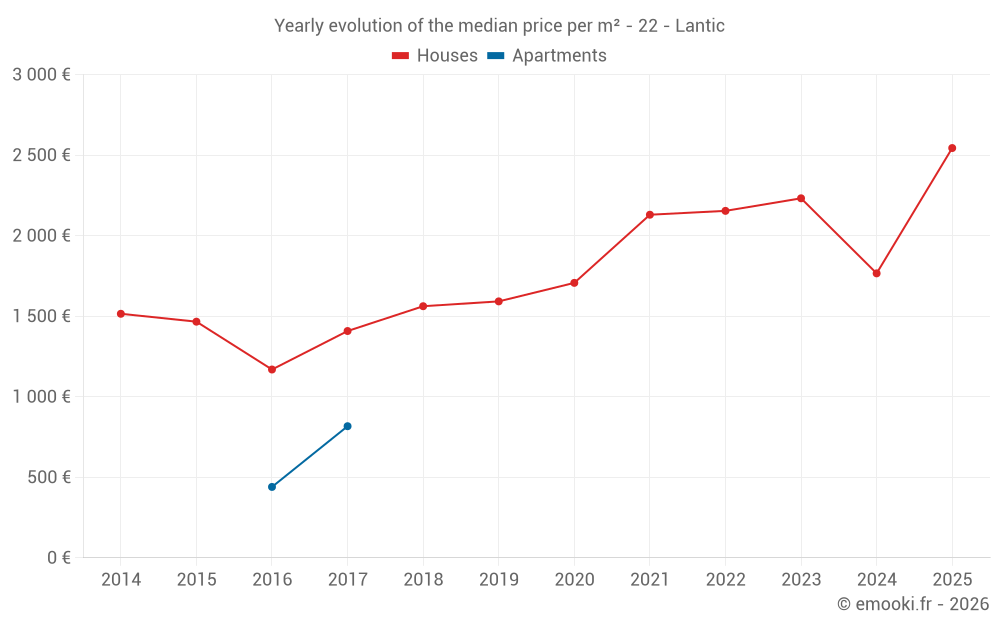 The median price on the 20 house transactions of the last 12 months in the municipality of Lantic was 2 521 € per square meter for a median property value of 194 500 €. Over this period, 60% of transactions were between 1 282 and 3 050 € per square meter (from the 2nd to the 8th deciles).