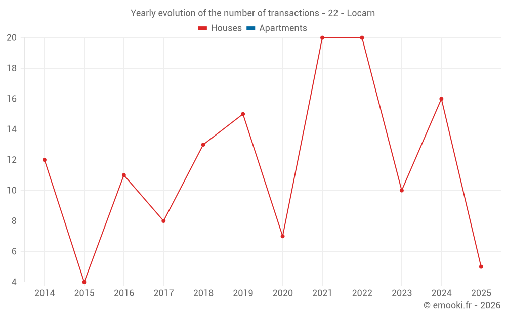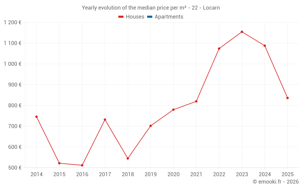 The median price on the 19 house transactions of the last 12 months in the municipality of Locarn was 927 € per square meter for a median property value of 80 000 €. Over this period, 60% of transactions were between 605 and 1 218 € per square meter (from the 2nd to the 8th deciles).