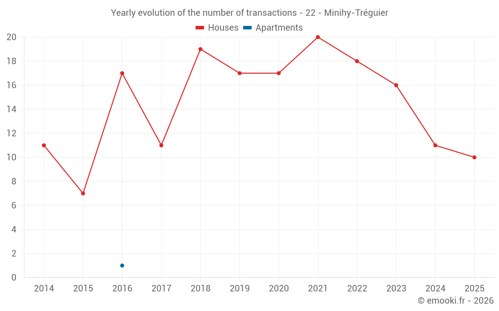 The median price on the 30 house transactions of the last 24 months in the municipality of Minihy-Tréguier was 1 668 € per square meter for a median property value of 191 375 €. Over this period, 60% of transactions were between 1 042 and 2 338 € per square meter (from the 2nd to the 8th deciles).