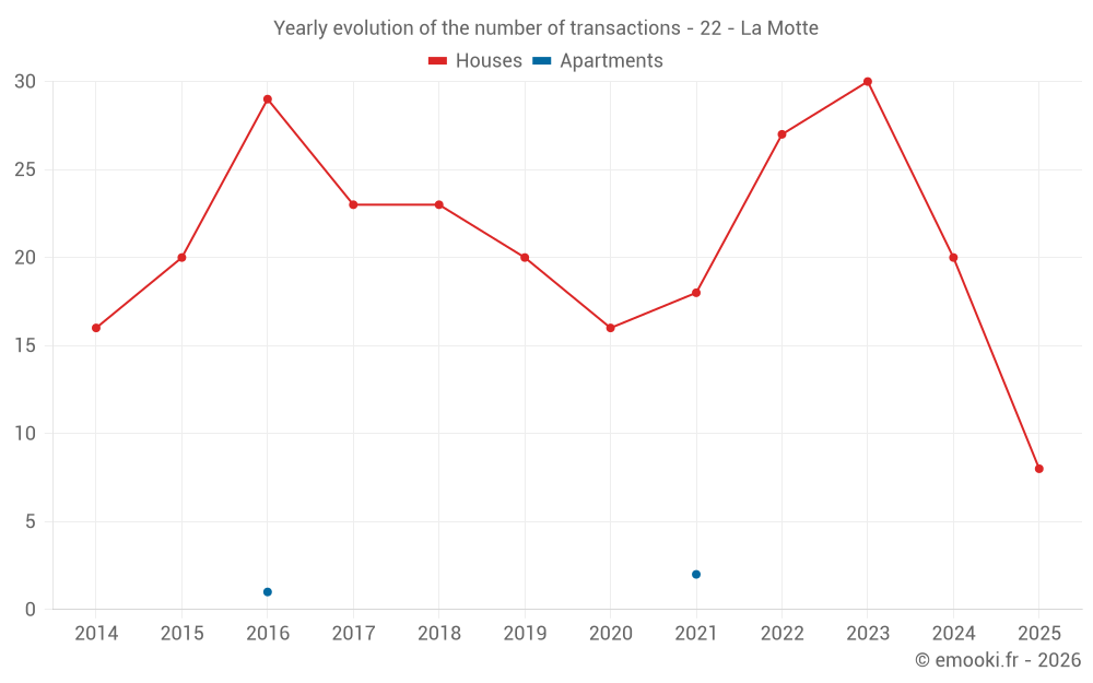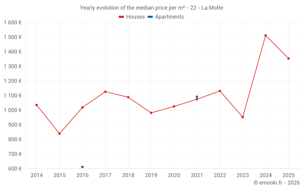 The median price on the 17 house transactions of the last 12 months in the municipality of La Motte was 1 518 € per square meter for a median property value of 168 500 €. Over this period, 60% of transactions were between 1 122 and 1 781 € per square meter (from the 2nd to the 8th deciles).