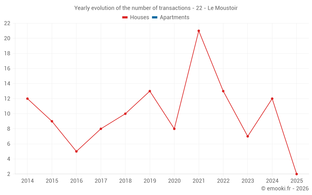 The median price on the 20 house transactions of the last 24 months in the municipality of Le Moustoir was 1 207 € per square meter for a median property value of 115 000 €. Over this period, 60% of transactions were between 878 and 1 671 € per square meter (from the 2nd to the 8th deciles).
