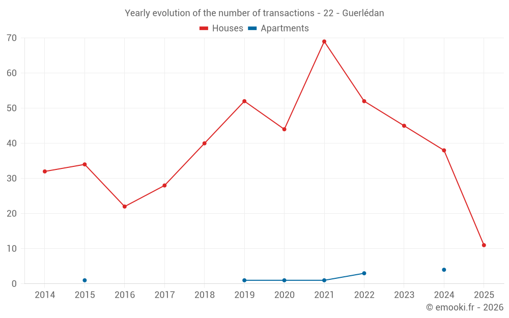 The median price on the 30 house transactions of the last 12 months in the municipality of Guerlédan was 1 322 € per square meter for a median property value of 117 500 €. Over this period, 60% of transactions were between 683 and 1 903 € per square meter (from the 2nd to the 8th deciles).