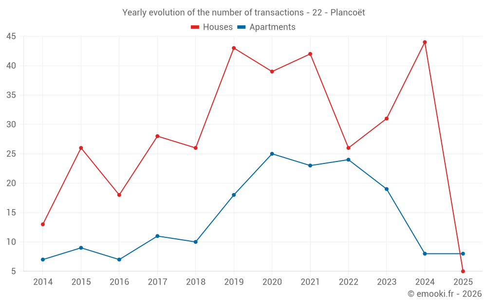 The median price on the 29 house transactions of the last 12 months in the municipality of Plancoët was 2 222 € per square meter for a median property value of 191 400 €. Over this period, 60% of transactions were between 1 422 and 2 716 € per square meter (from the 2nd to the 8th deciles).