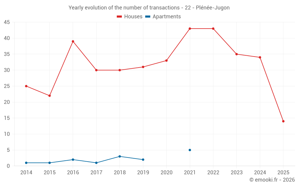 The median price on the 33 house transactions of the last 12 months in the municipality of Plénée-Jugon was 1 500 € per square meter for a median property value of 148 000 €. Over this period, 60% of transactions were between 1 116 and 2 042 € per square meter (from the 2nd to the 8th deciles).