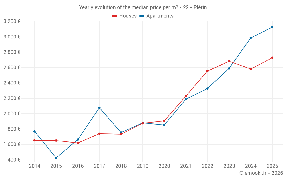 The median price on the 19 apartment transactions of the last 6 months in the municipality of Plérin was 3 125 € per square meter for a median property value of 153 000 €. Over this period, 60% of transactions were between 2 275 and 3 623 € per square meter (from the 2nd to the 8th deciles).