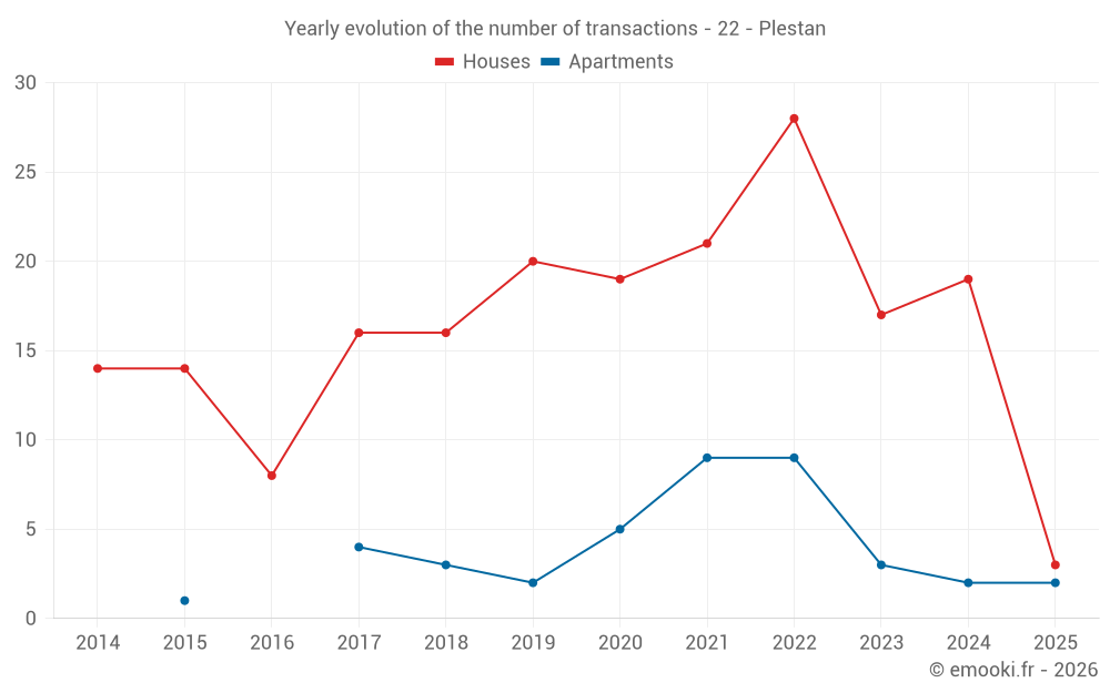The median price on the 29 house transactions of the last 24 months in the municipality of Plestan was 1 313 € per square meter for a median property value of 150 000 €. Over this period, 60% of transactions were between 1 052 and 1 881 € per square meter (from the 2nd to the 8th deciles).