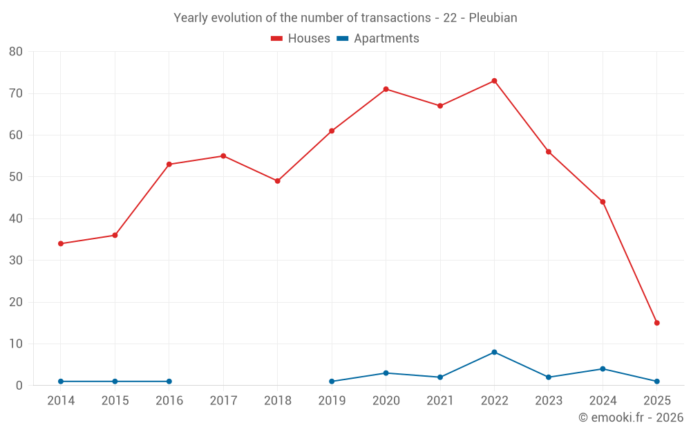 The median price on the 42 house transactions of the last 12 months in the municipality of Pleubian was 2 181 € per square meter for a median property value of 204 500 €. Over this period, 60% of transactions were between 1 601 and 2 865 € per square meter (from the 2nd to the 8th deciles).