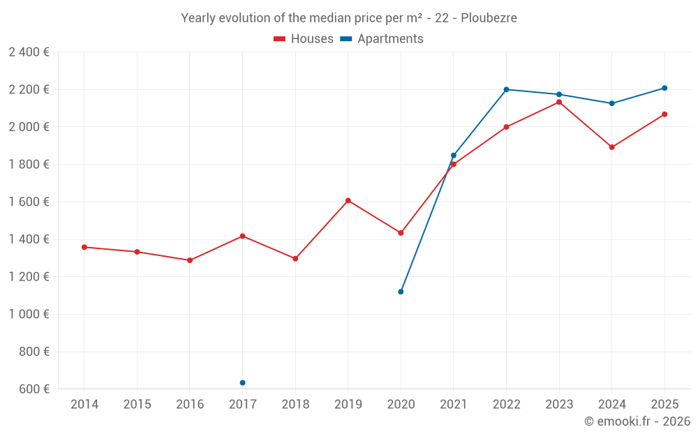 The median price on the 18 house transactions of the last 6 months in the municipality of Ploubezre was 2 068 € per square meter for a median property value of 187 500 €. Over this period, 60% of transactions were between 931 and 2 401 € per square meter (from the 2nd to the 8th deciles).