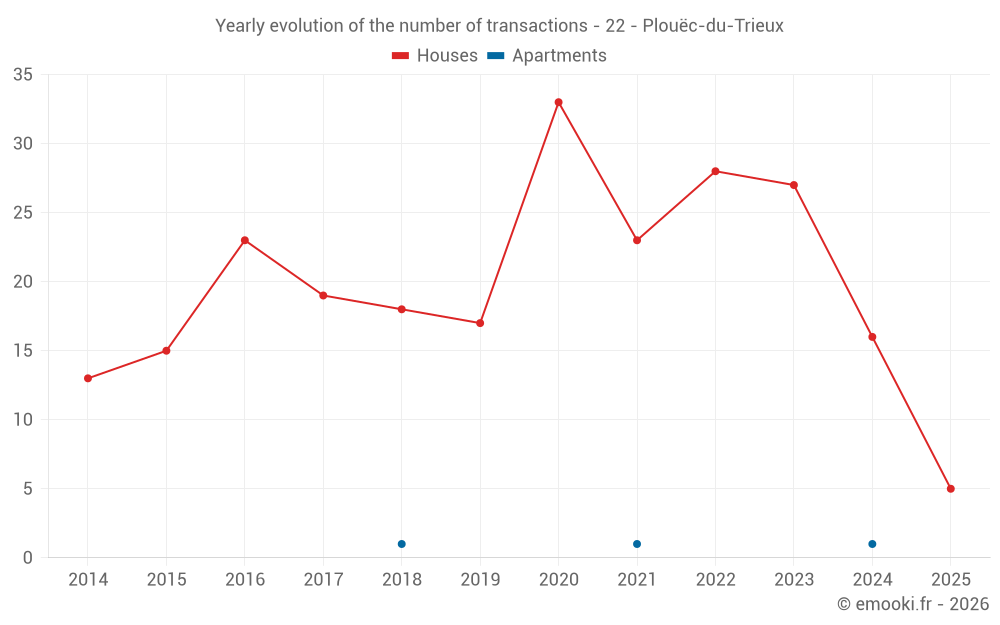The median price on the 16 house transactions of the last 12 months in the municipality of Plouëc-du-Trieux was 1 658 € per square meter for a median property value of 152 000 €. Over this period, 60% of transactions were between 1 355 and 2 398 € per square meter (from the 2nd to the 8th deciles).