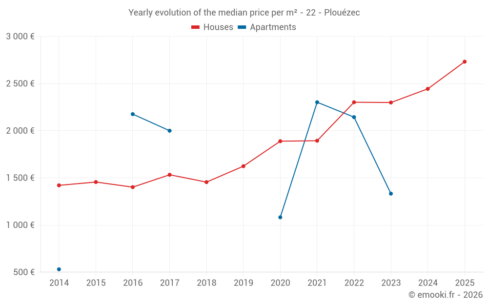 The median price on the 22 house transactions of the last 6 months in the municipality of Plouézec was 2 732 € per square meter for a median property value of 212 500 €. Over this period, 60% of transactions were between 2 245 and 3 395 € per square meter (from the 2nd to the 8th deciles).