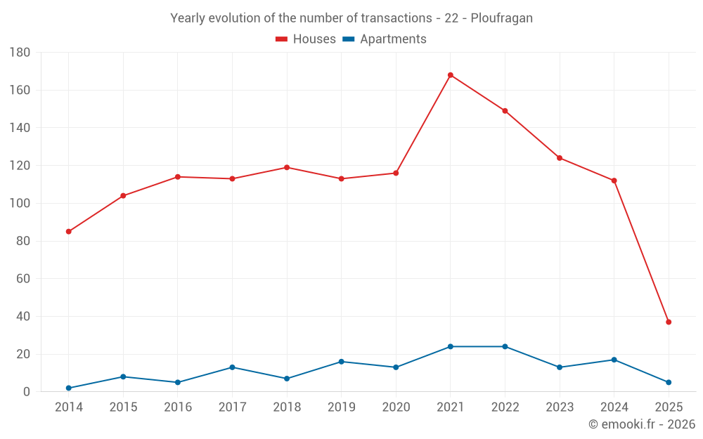 The median price on the 37 house transactions of the last 6 months in the municipality of Ploufragan was 2 179 € per square meter for a median property value of 190 000 €. Over this period, 60% of transactions were between 1 621 and 2 490 € per square meter (from the 2nd to the 8th deciles).