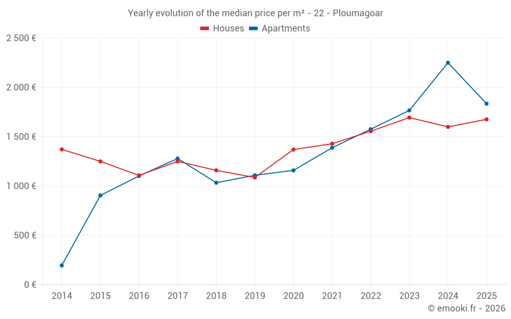 The median price on the 21 house transactions of the last 6 months in the municipality of Ploumagoar was 1 676 € per square meter for a median property value of 165 000 €. Over this period, 60% of transactions were between 1 333 and 2 412 € per square meter (from the 2nd to the 8th deciles).