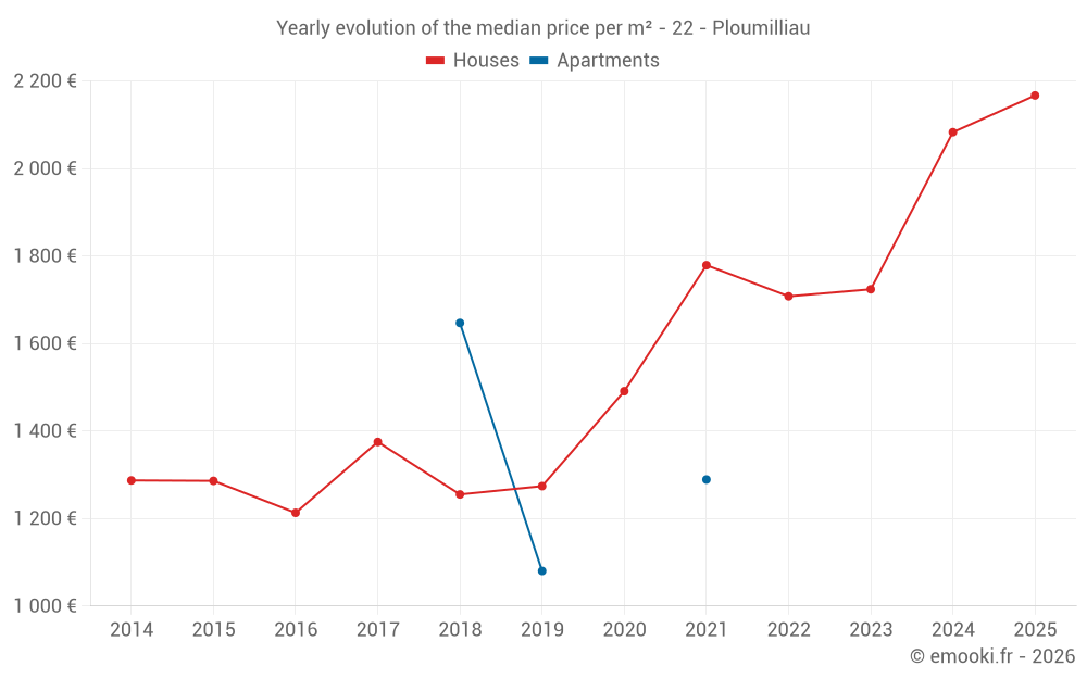 The median price on the 31 house transactions of the last 12 months in the municipality of Ploumilliau was 2 145 € per square meter for a median property value of 181 000 €. Over this period, 60% of transactions were between 1 573 and 3 175 € per square meter (from the 2nd to the 8th deciles).