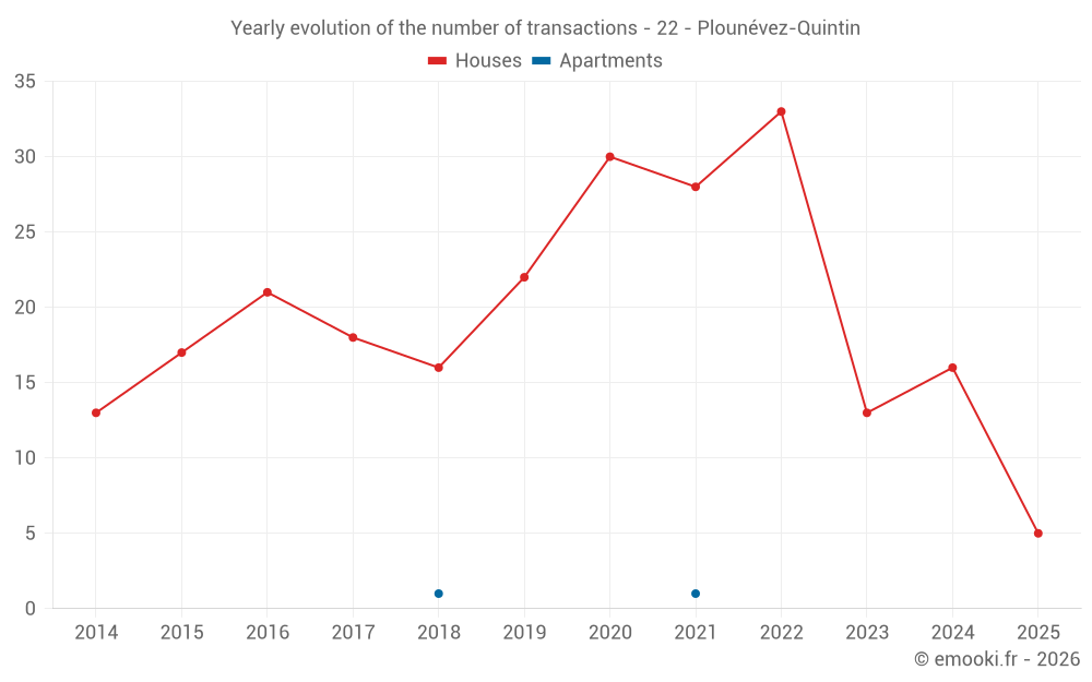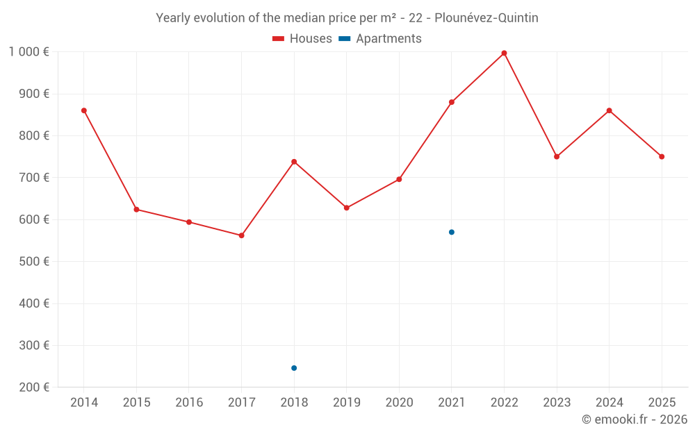The median price on the 16 house transactions of the last 12 months in the municipality of Plounévez-Quintin was 852 € per square meter for a median property value of 89 000 €. Over this period, 60% of transactions were between 435 and 1 563 € per square meter (from the 2nd to the 8th deciles).