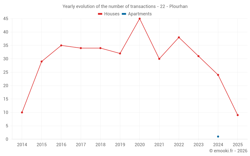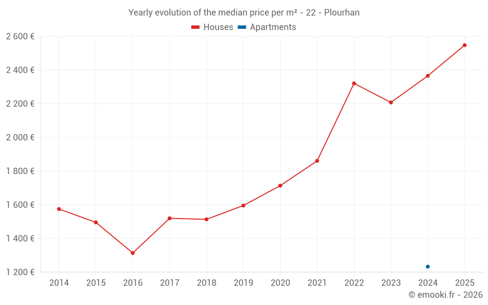 The median price on the 23 house transactions of the last 12 months in the municipality of Plourhan was 2 512 € per square meter for a median property value of 250 000 €. Over this period, 60% of transactions were between 1 894 and 2 921 € per square meter (from the 2nd to the 8th deciles).