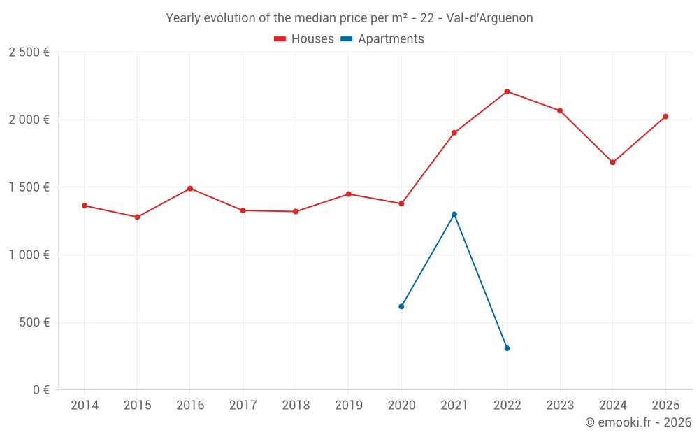 The median price on the 26 house transactions of the last 12 months in the municipality of Val-d'Arguenon was 1 806 € per square meter for a median property value of 170 000 €. Over this period, 60% of transactions were between 1 340 and 2 361 € per square meter (from the 2nd to the 8th deciles).