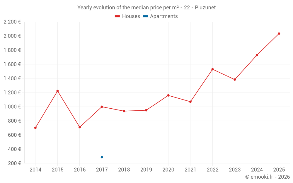 The median price on the 28 house transactions of the last 24 months in the municipality of Pluzunet was 1 500 € per square meter for a median property value of 119 000 €. Over this period, 60% of transactions were between 1 058 and 1 990 € per square meter (from the 2nd to the 8th deciles).