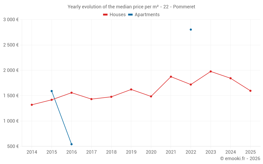 The median price on the 31 house transactions of the last 24 months in the municipality of Pommeret was 1 765 € per square meter for a median property value of 175 000 €. Over this period, 60% of transactions were between 1 257 and 2 500 € per square meter (from the 2nd to the 8th deciles).