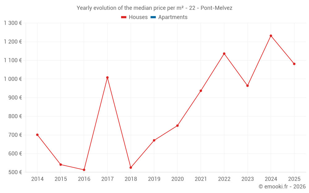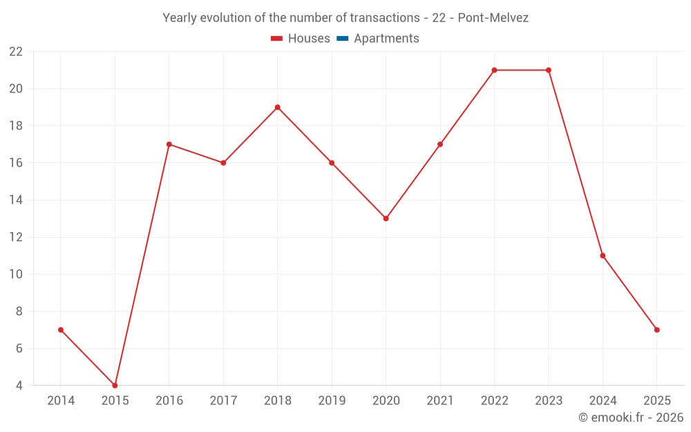 The median price on the 33 house transactions of the last 24 months in the municipality of Pont-Melvez was 1 000 € per square meter for a median property value of 88 000 €. Over this period, 60% of transactions were between 623 and 1 573 € per square meter (from the 2nd to the 8th deciles).
