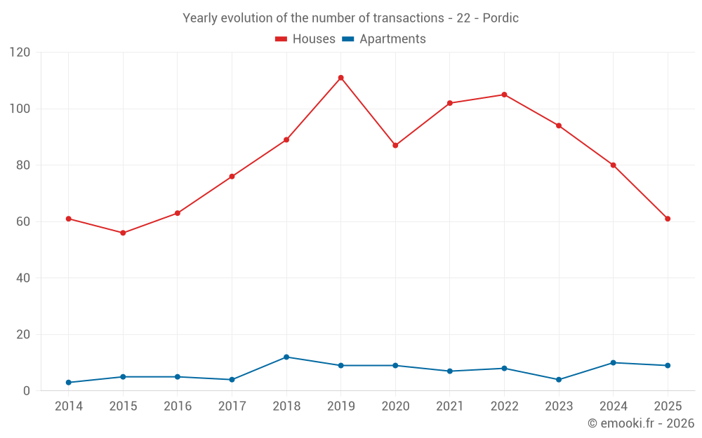 The median price on the 26 house transactions of the last 6 months in the municipality of Pordic was 2 429 € per square meter for a median property value of 227 500 €. Over this period, 60% of transactions were between 1 622 and 3 021 € per square meter (from the 2nd to the 8th deciles).