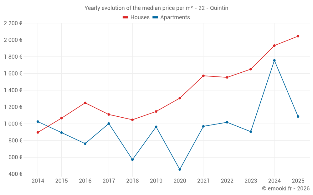 The median price on the 19 house transactions of the last 6 months in the municipality of Quintin was 2 014 € per square meter for a median property value of 230 000 €. Over this period, 60% of transactions were between 1 774 and 2 951 € per square meter (from the 2nd to the 8th deciles).