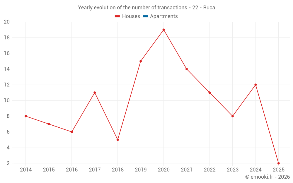 The median price on the 19 house transactions of the last 24 months in the municipality of Ruca was 2 064 € per square meter for a median property value of 227 000 €. Over this period, 60% of transactions were between 1 655 and 2 351 € per square meter (from the 2nd to the 8th deciles).