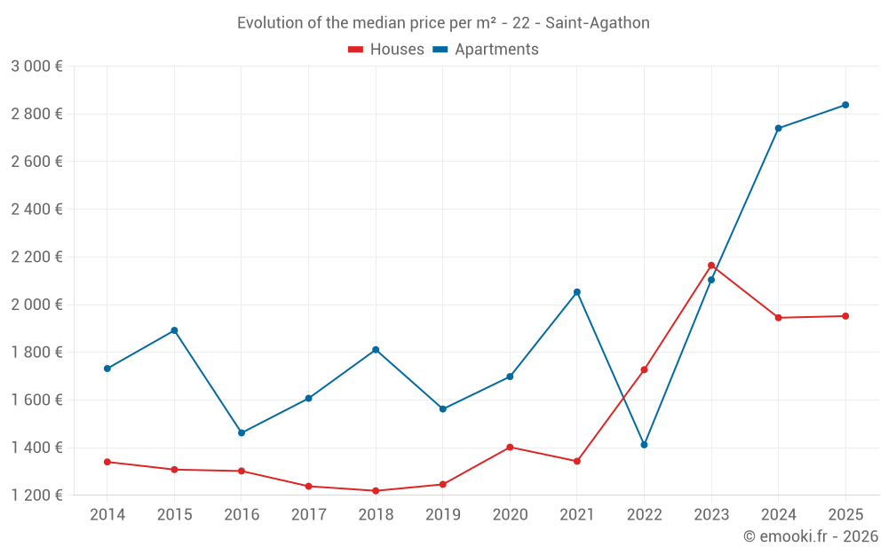 The median price on the 20 house transactions of the last 12 months in the municipality of Saint-Agathon was 2 040 € per square meter for a median property value of 179 000 €. Over this period, 60% of transactions were between 1 345 and 2 375 € per square meter (from the 2nd to the 8th deciles).